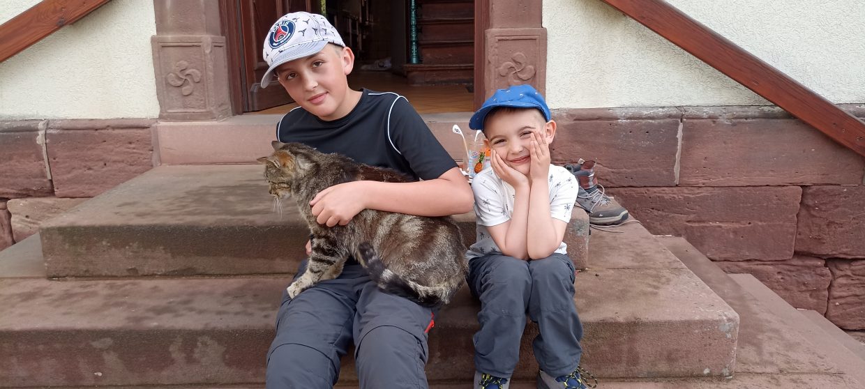 Entre 9h et 10h30, nous avons fini de lever le camp, et nous avons demandé aux gérants du restaurant si nous pouvions utiliser les WC et boire quelque chose avant de partir. Ils étaient vraiment gentils et ont accepté. Les garçons ont fait la rencontre de leur chat qui leur a fait pleins de câlins 🐈‍⬛🐾