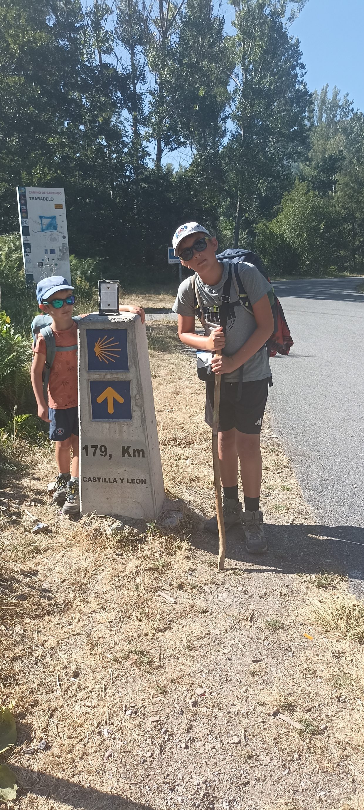 Cette fois c’est bon, on est sur le chemin ! Pas de bol, c’est tout du long à côté de la route, Heureusement pas trop fréquentée mais en plein soleil. Et à cette heure-ci, il tape bien le soleil ! On marche les 5 premiers kilomètres, et on s’arrête au village de Pereje. Il est un peu mort et il n’y a pas grand chose. Les bars sont fermés donc on s’arrête sur les marches de l’auberge qui est elle aussi fermée. On est à l’ombre et on peut remplir nos gourdes avec de l’eau bien fraîche. On se pose 20 min avant de repartir à 17h pour les 5 derniers kilomètres avant Trabadelo.